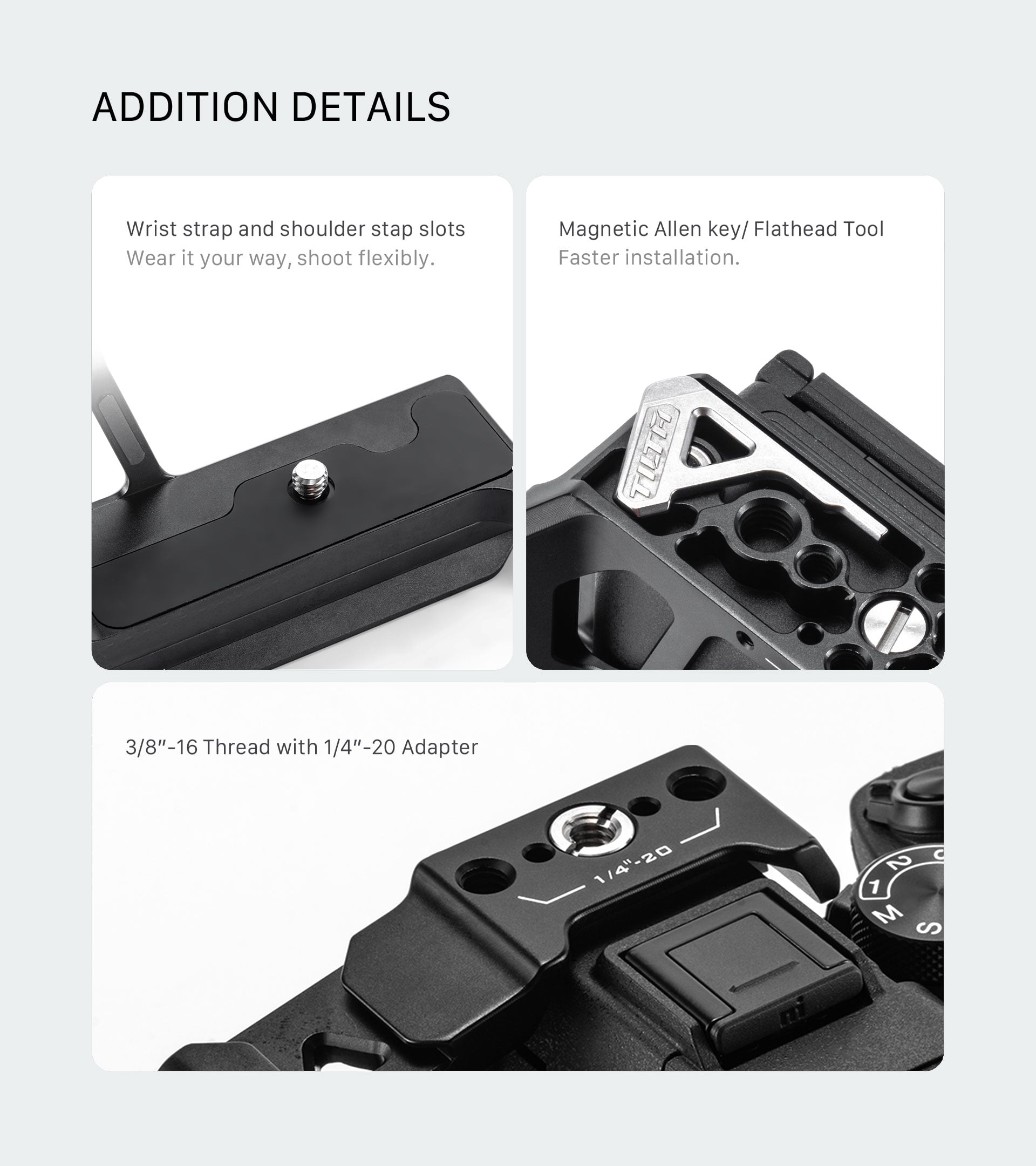Precision-engineered for clearance, the cage maintains the natural handling of the camera without obstructing buttons, the battery compartment, OEM flash units, microphone handles, or lens adapters.